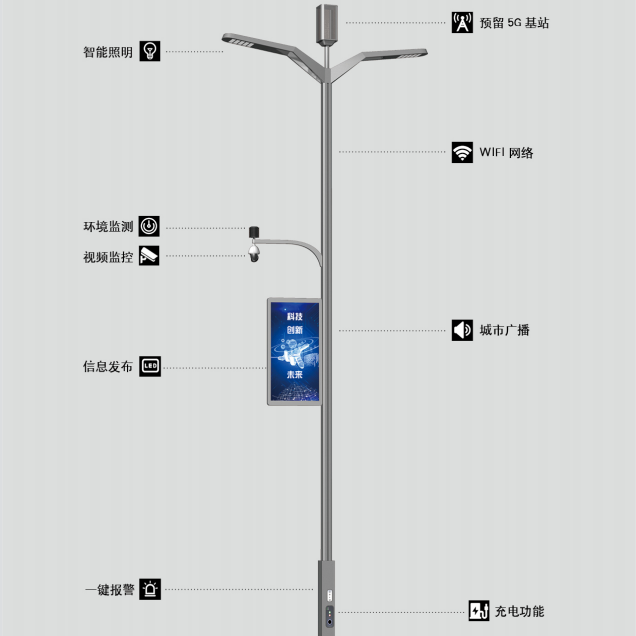 立桿成品含桿體、橫臂、避雷針(可選)、底板法蘭、檢修口等,桿到工地即可安裝使用??杉优涞鼗\及防水箱。橫臂連接螺栓采用不銹鋼螺栓。